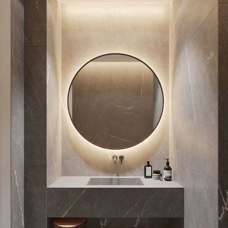 Backlit mirrors (CRI ≥ 90) create flattering light; under-desk lighting improves workspace usability.