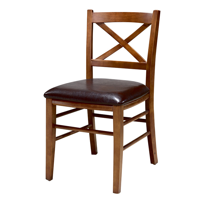 The STLOU1137 Hotel Dining Chair blends rustic charm with commercial durability. Featuring a solid wood frame with a cross-back design, this chair brings timeless elegance to hotel restaurants, breakfast areas, and classic cafés. The seat is upholstered in deep brown leatherette, offering both comfort and a sophisticated touch.