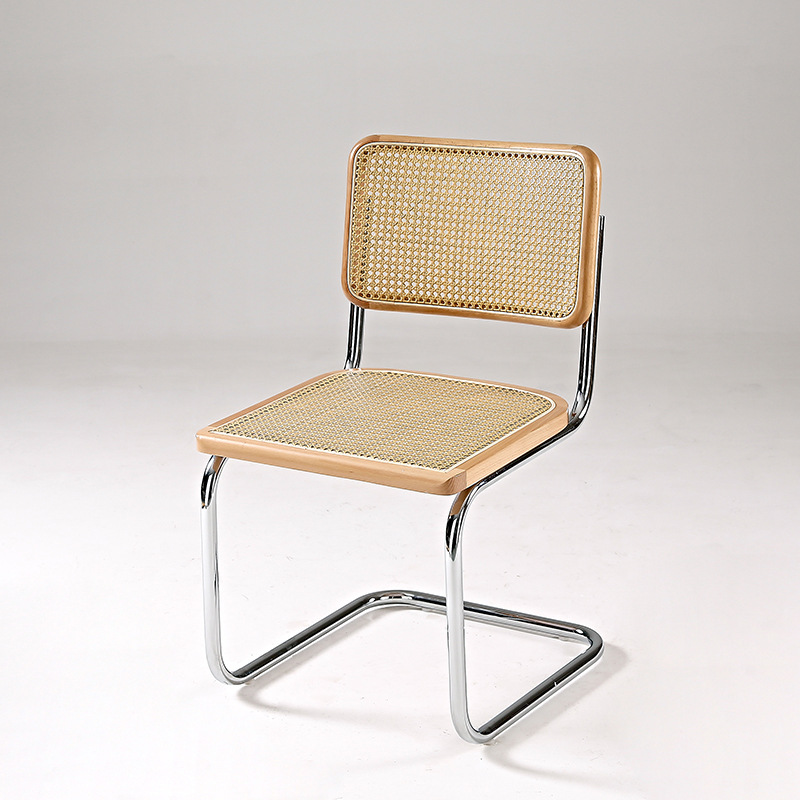 The STLOC1167 hotel dining chair combines timeless natural elegance with durable construction, making it an excellent choice for modern hotel dining spaces. This hotel furniture piece features a natural rattan backrest and seat that add a warm, organic texture, creating a relaxed and inviting atmosphere. The chrome-plated steel cantilever frame provides a sleek, modern aesthetic while offering robust support.