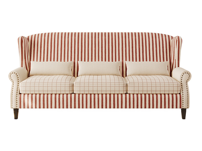 The STLLB415 sofa brings a distinct vintage flair to hotel interiors with its bold red and beige striped fabric. Designed with a tall wingback silhouette and three seat cushions, it offers generous support and comfort. The traditional nailhead trim and check-pattern cushions add elegance, making it ideal for classic or boutique hotels.