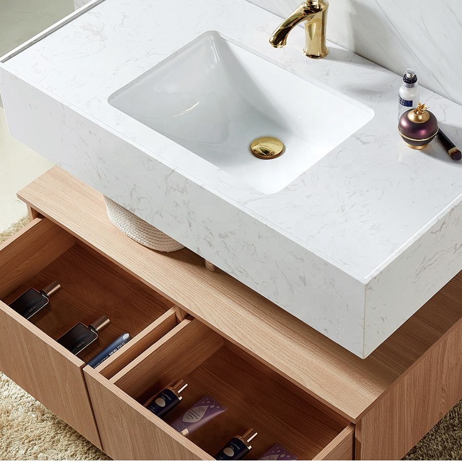 The STLCA4284 Hotel Cabinet is crafted to enhance both the style and practicality of modern hotel bathrooms. This cabinet features a floating design that maximizes floor space while creating a clean and minimal look. The durable countertop supports a square ceramic basin, paired with a black faucet for a bold accent. Below, the spacious wooden drawers provide hidden storage for towels, toiletries, and bathroom essentials, ensuring a neat and organized environment.