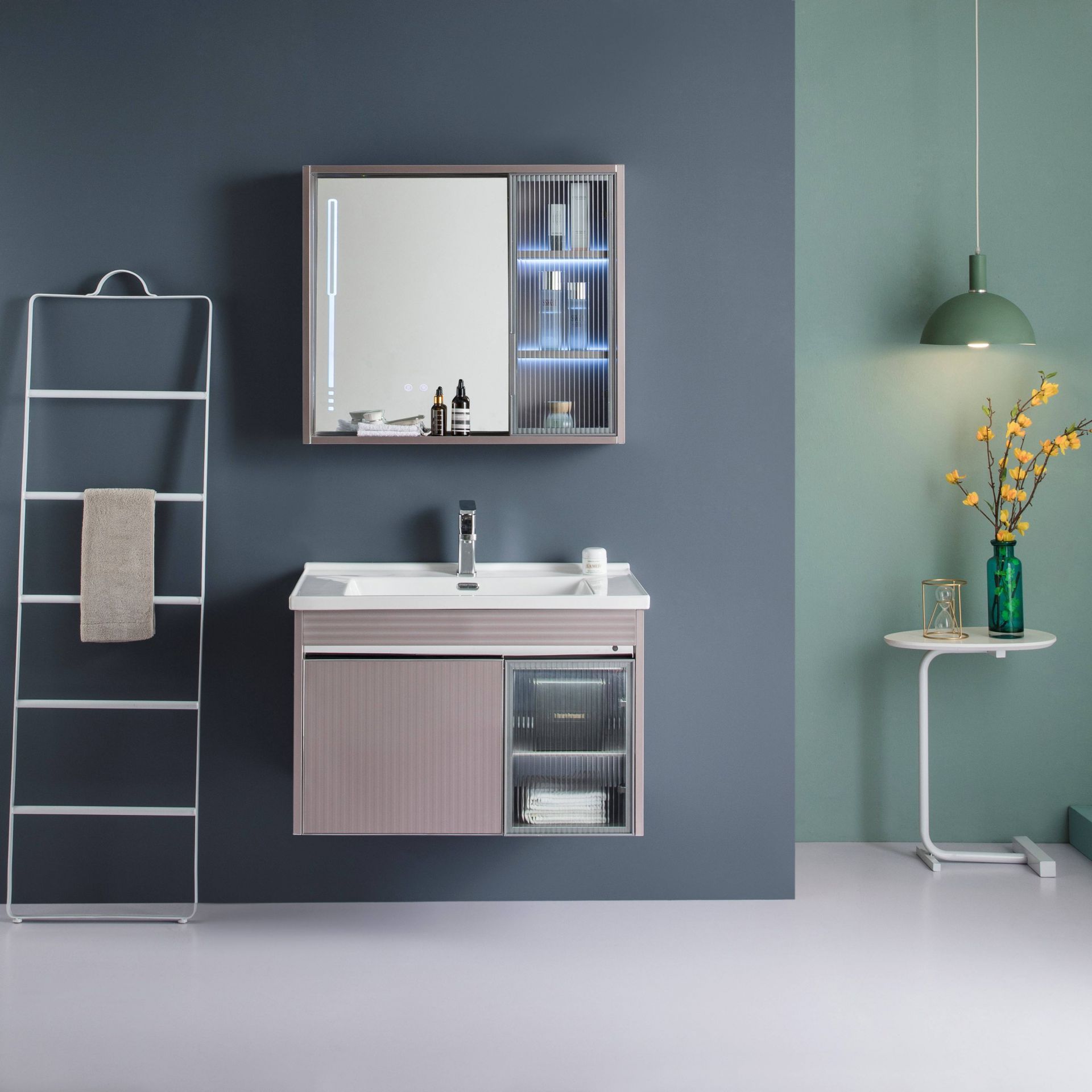 The STLCA4312 Hotel Cabinet brings a touch of elegance to hospitality bathrooms with its fluted panel design and clean wall-mounted style. The vanity base features concealed storage combined with a frosted glass compartment, providing both practicality and a decorative element.
