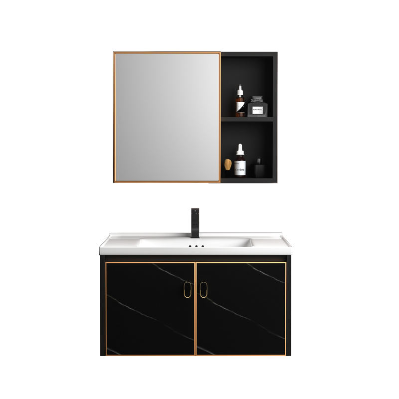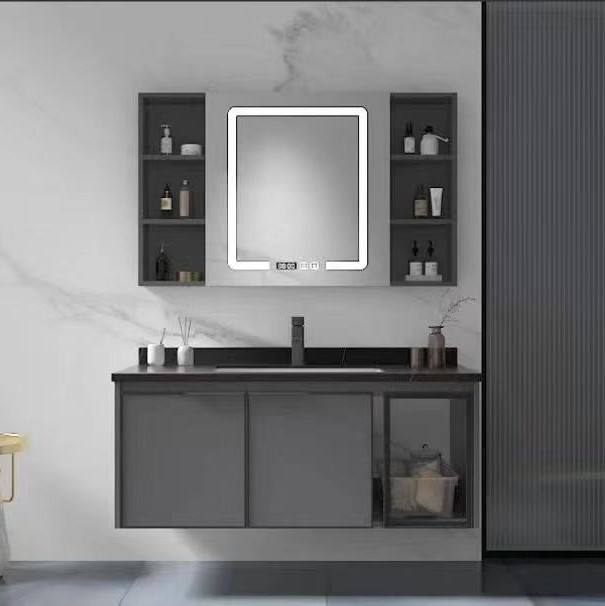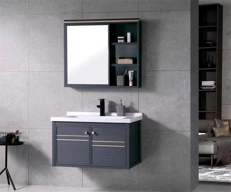 The STLCA4502 Hotel Bathroom Cabinet reflects timeless style with a modern twist, featuring dual cabinet doors accented by elegant horizontal trims. This design complements grey stone wall tiles and minimalistic interiors, making it a versatile choice for hotel bathrooms.