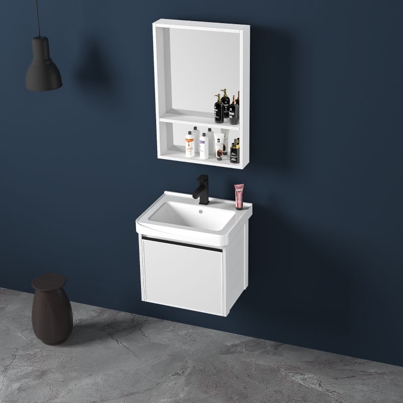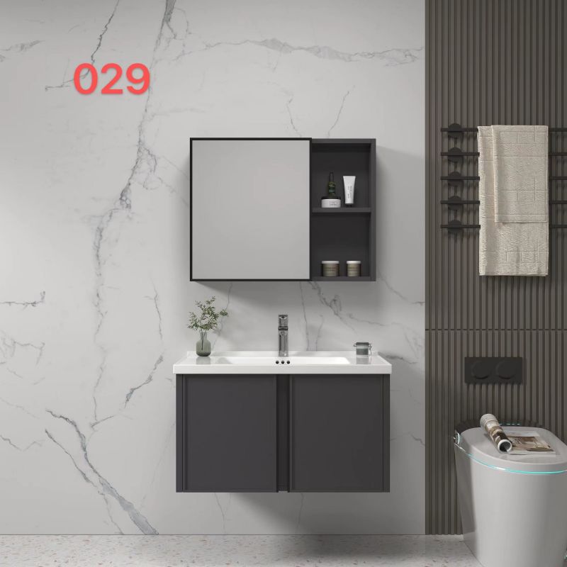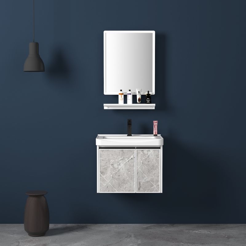 The vanity includes double-door storage, ensuring ample space for towels and toiletries. Above, the mirror cabinet provides open shelving and a smooth reflective surface, helping maintain both convenience and elegance. The marble pattern finish adds a luxurious touch, complementing a wide range of hotel bathroom styles.