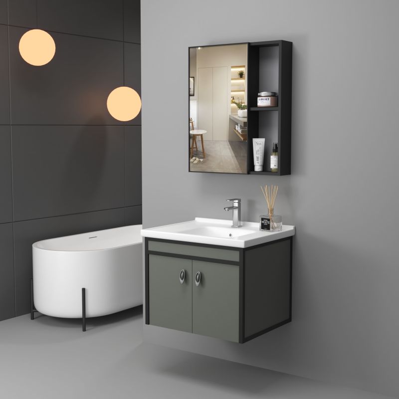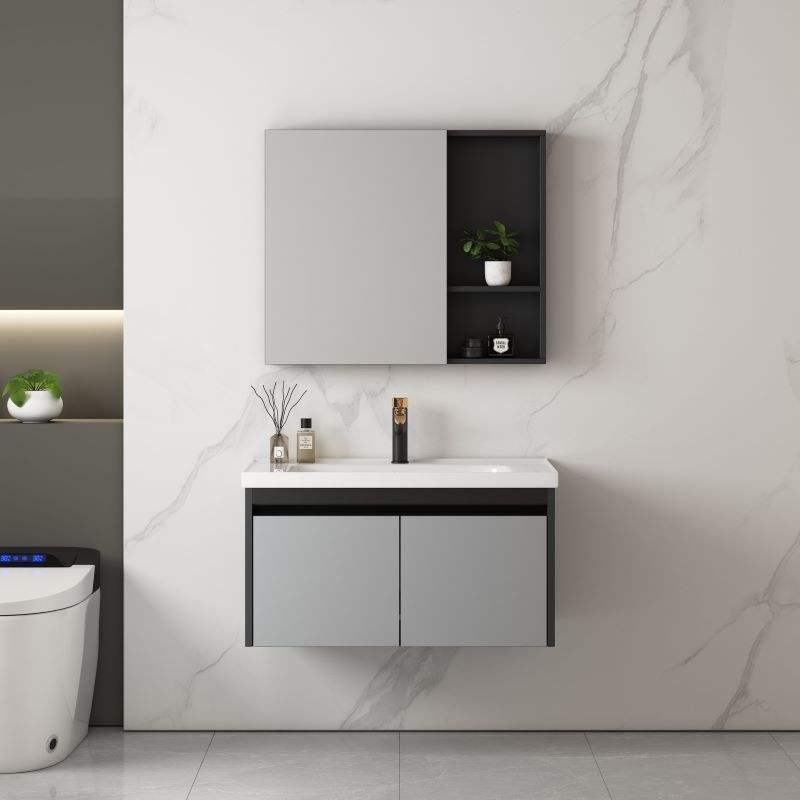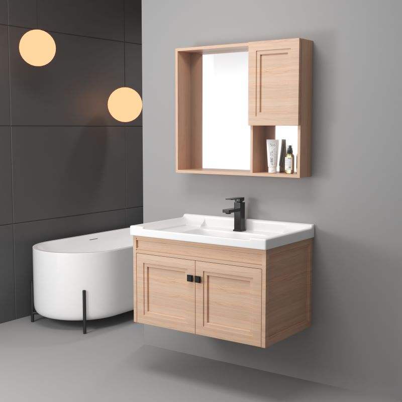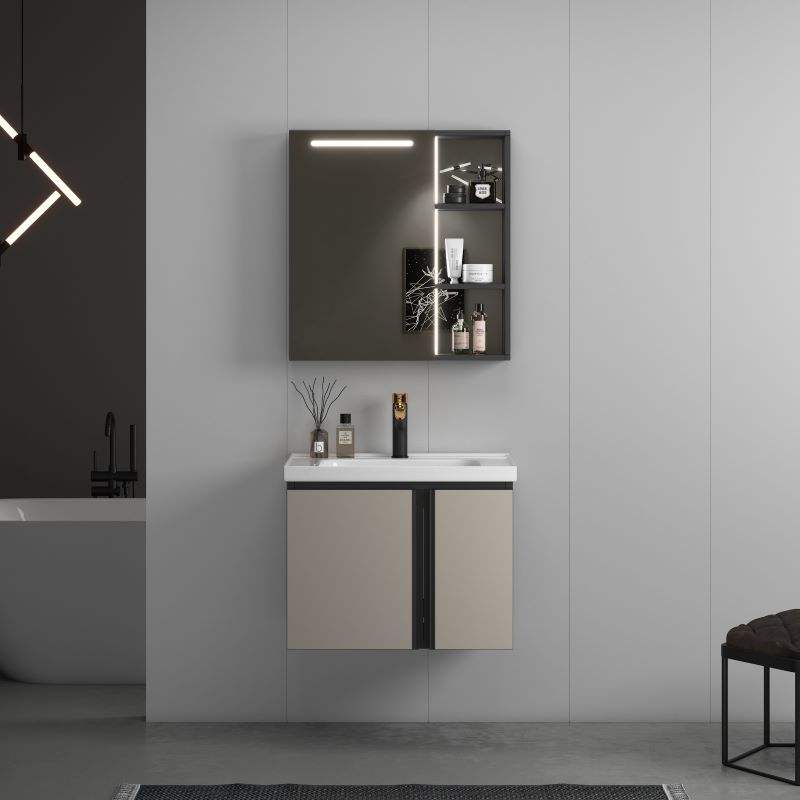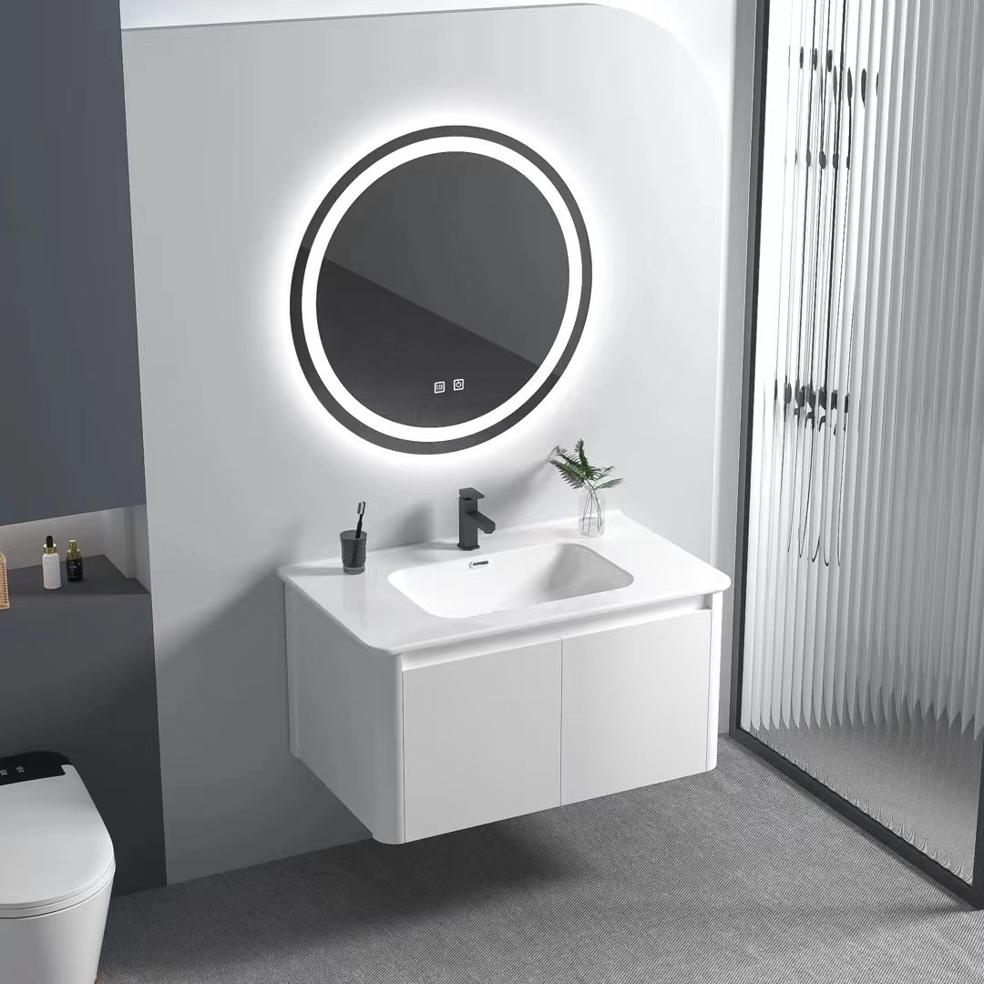 Beneath the mirror, the vanity features a spacious countertop with integrated basin and dual-door storage cabinet. This combination allows for efficient organization of toiletries and guest amenities, keeping the bathroom space clutter-free and functional. The wall-mounted design ensures maximum floor clearance, ideal for modern hotel settings that value both design and efficiency.