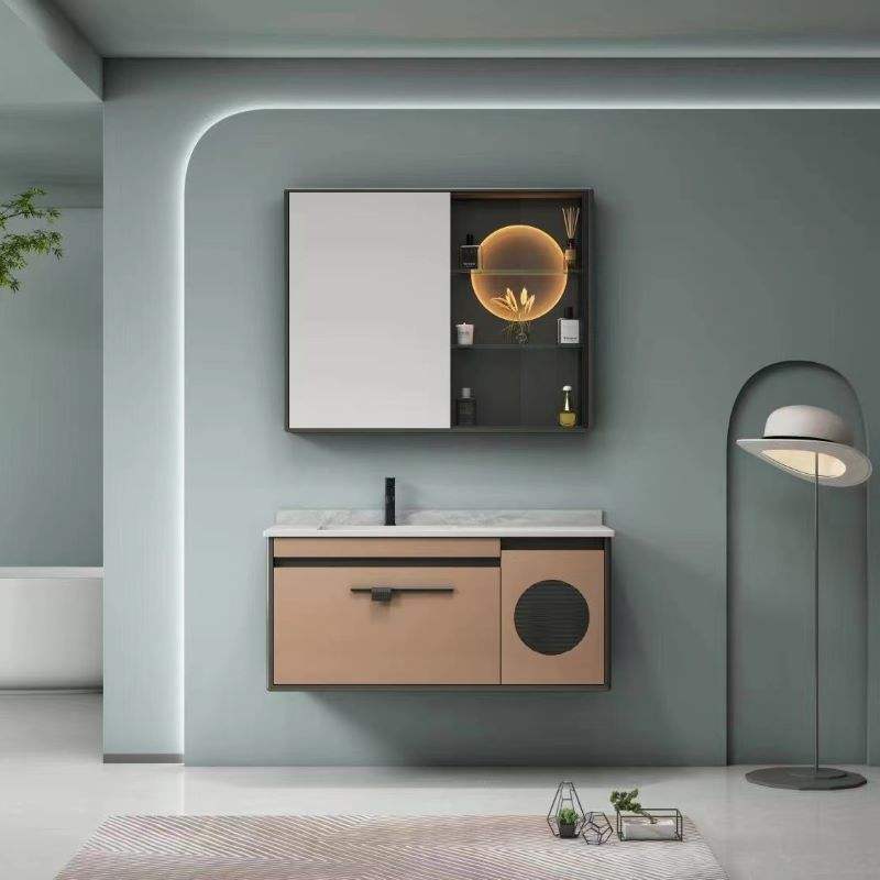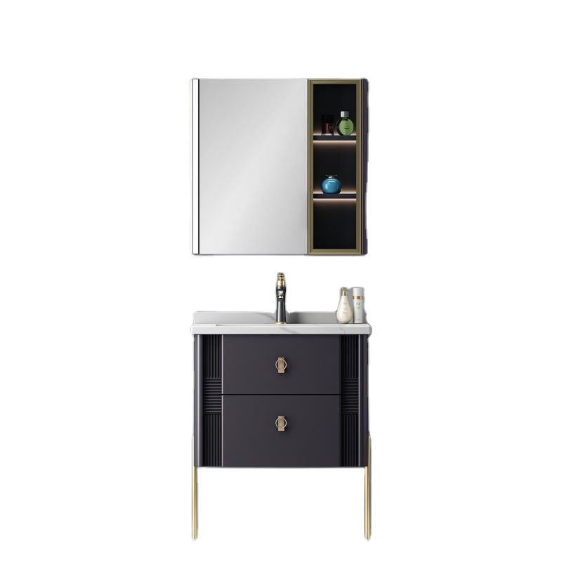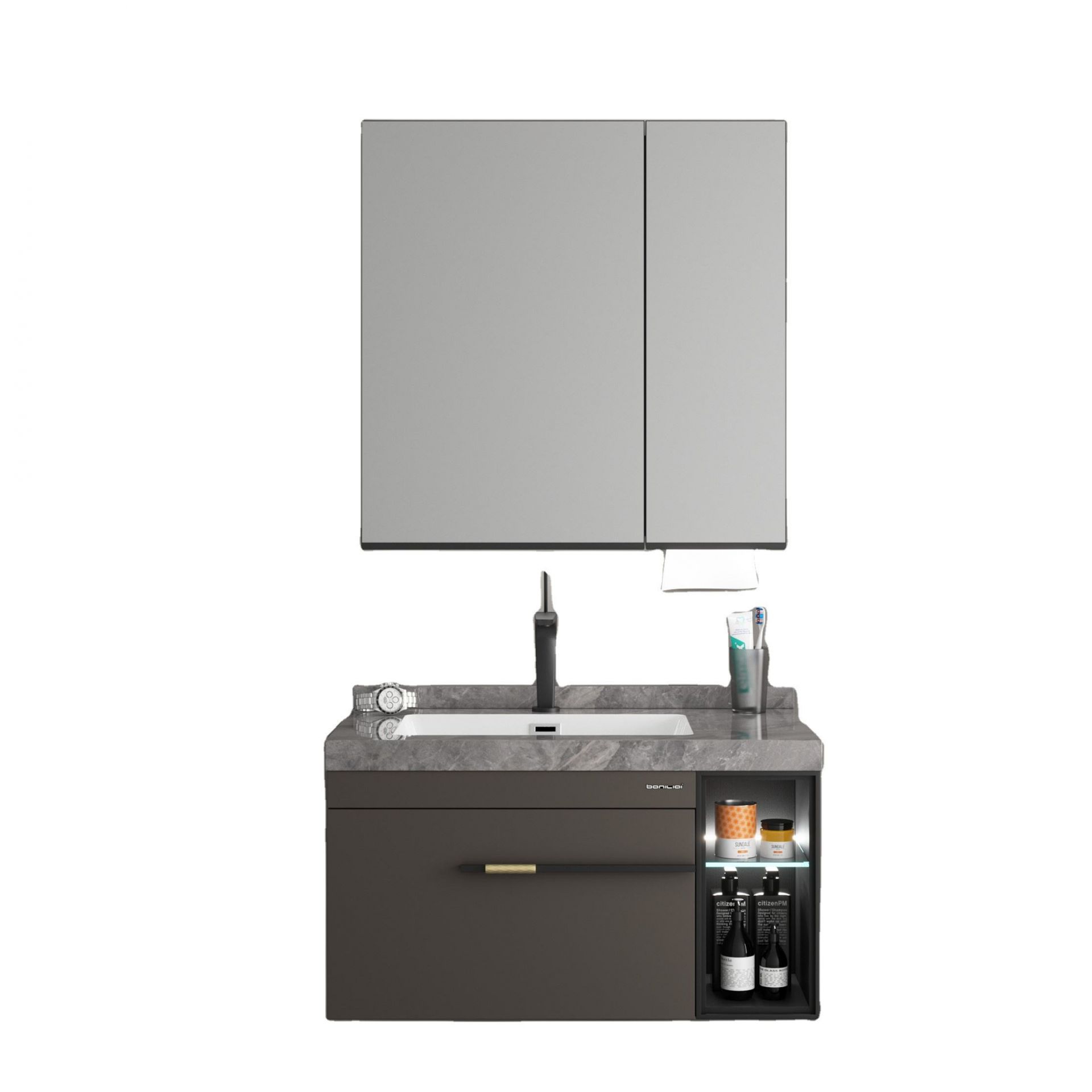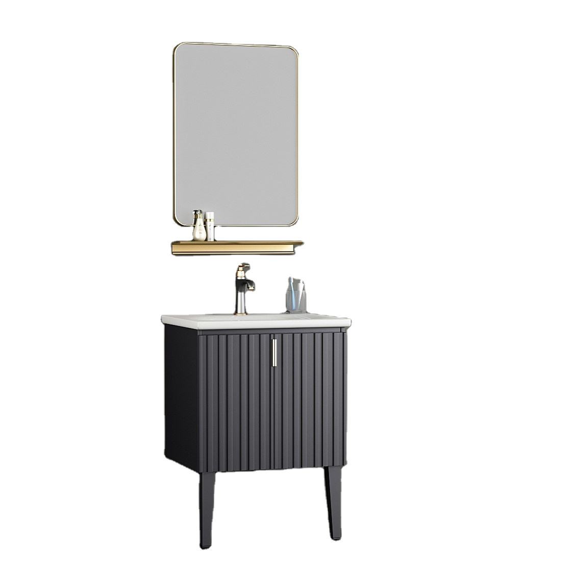 The Hotel Bathroom Cabinet STLBC5084 emphasizes modern craftsmanship with vertical groove detailing and a minimalist gold shelf beneath the mirror. Its tall, slim structure visually elongates the space, while the matte black finish offers a luxurious contrast to the light countertop.