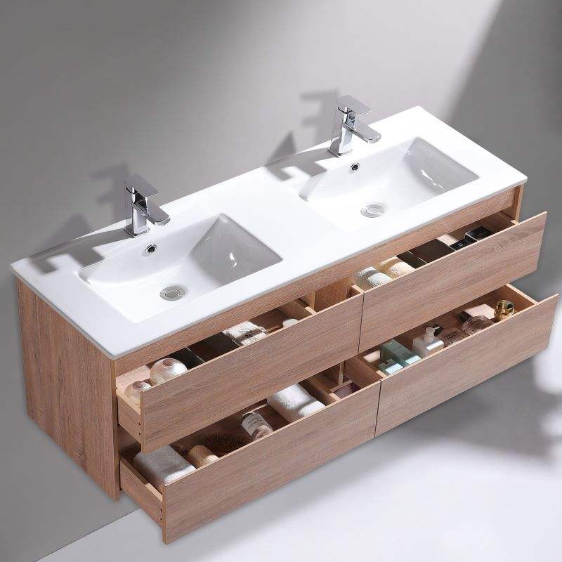 The Hotel Bathroom Cabinet STLBC5093 blends practicality and warmth with a double-sink ceramic top and a natural wood finish. Its wide drawers are designed with smart internal dividers, allowing organized storage for towels, skincare, and bath essentials.