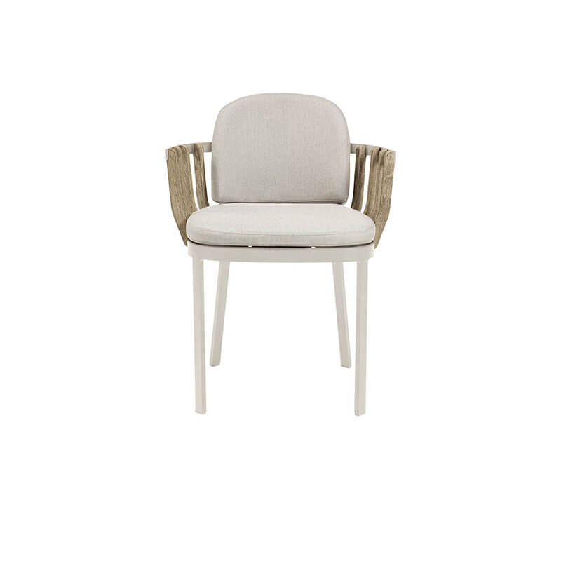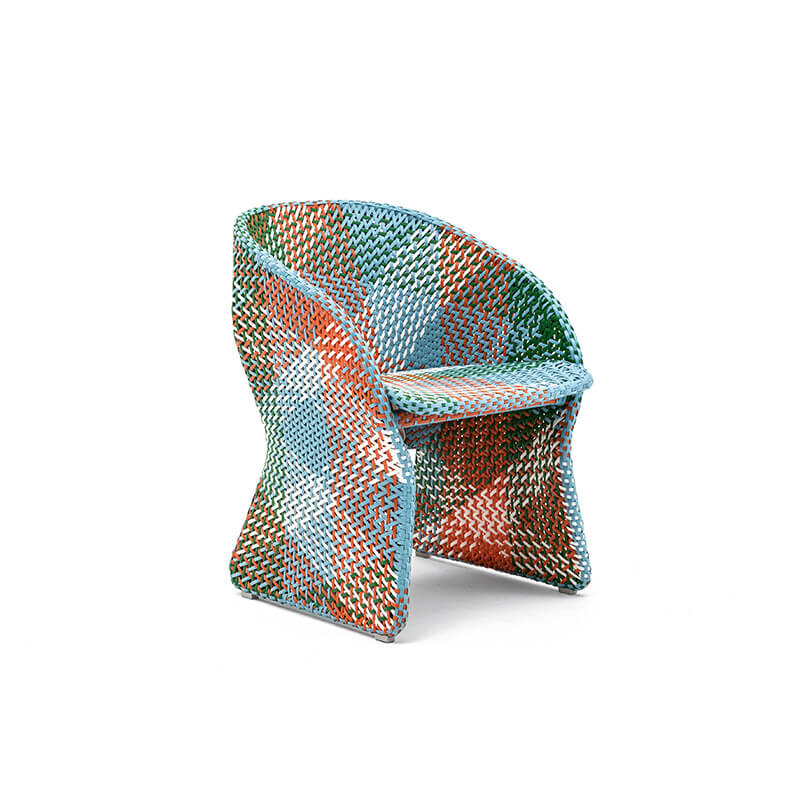 Despite its artistic design, the chair remains lightweight, durable, and weather-resistant, ensuring it can withstand the rigors of outdoor hospitality environments. Its ergonomic shape provides comfortable seating, while the bold woven pattern adds a playful and contemporary touch to any outdoor scene.