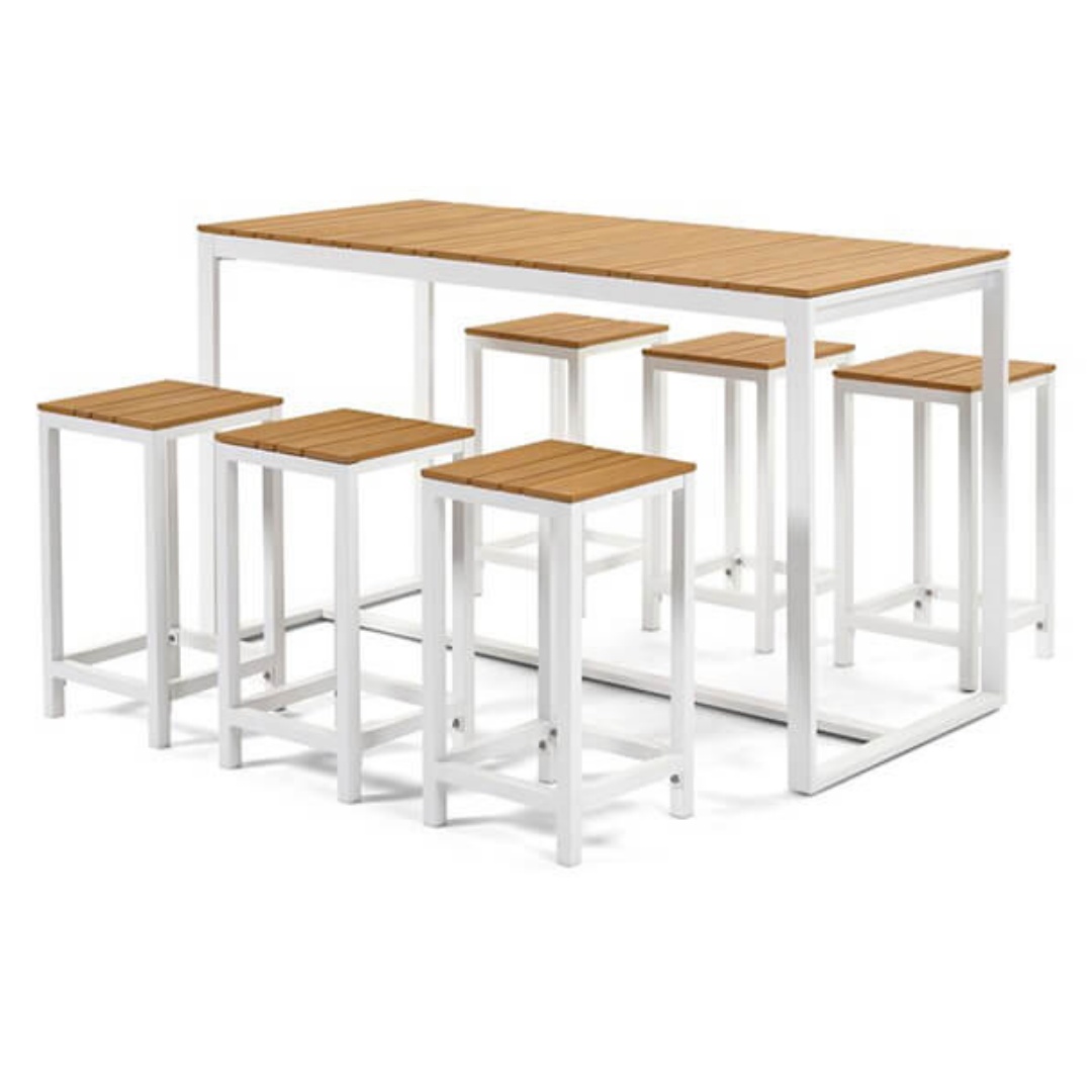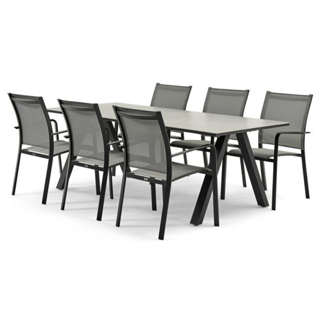 The contemporary garden furniture has made with aluminium frame with powder coating and sling fabric on seating.table top with ceramic glass