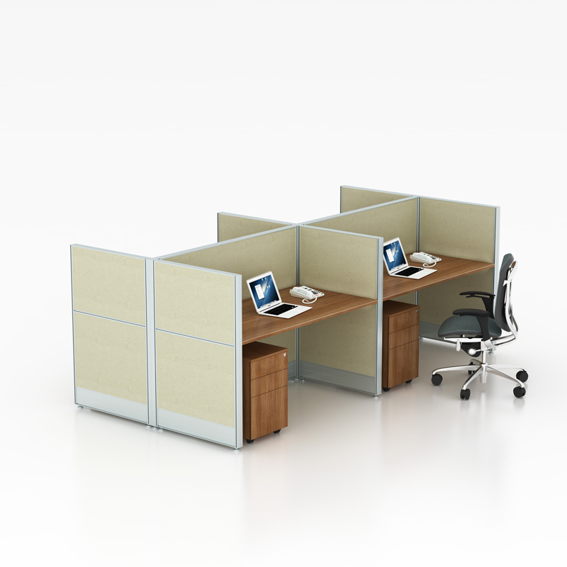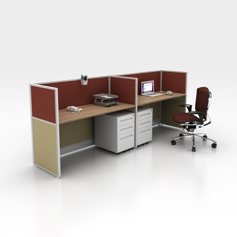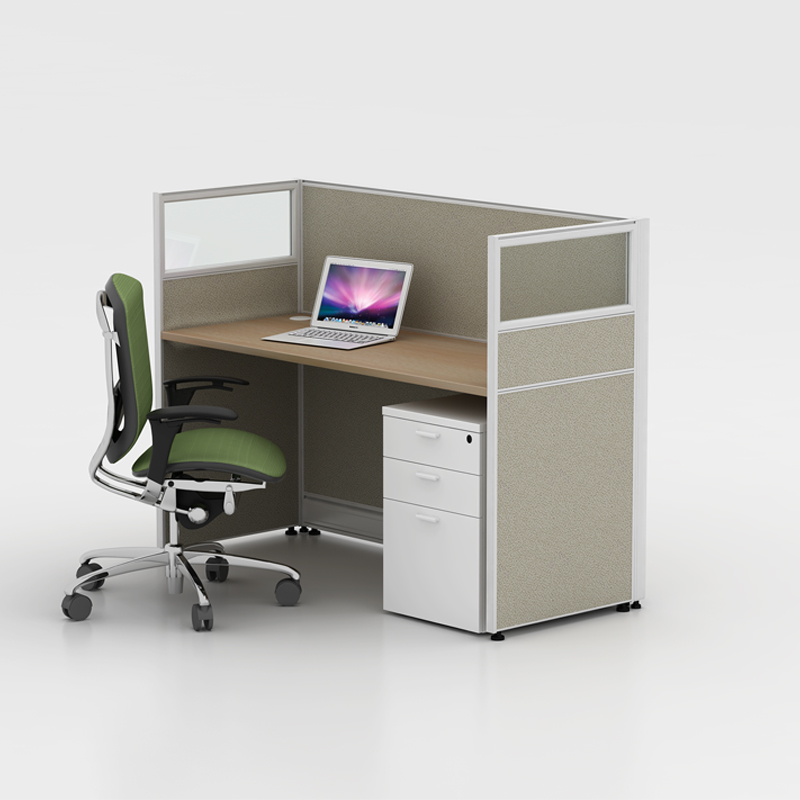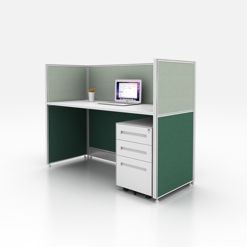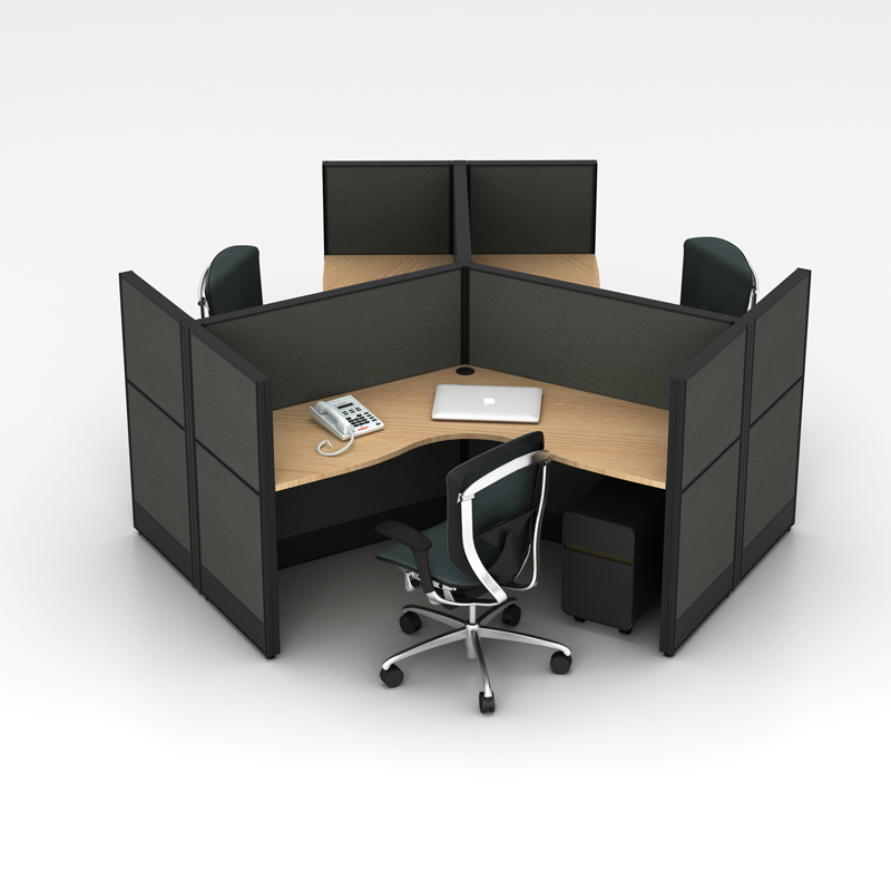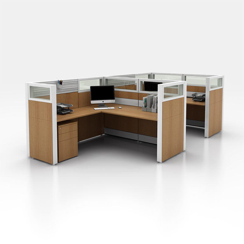 An office cubicle that balances privacy with collaboration is a semi-private cubicle. This style works best for employees with jobs that require both solitude to concentrate on tasks and communication with coworkers. In this design, an employee has their own desk and storage. The lower height of the walls offers privacy to give the employee their own space. However, this layout also makes it easy for employees to collaborate.