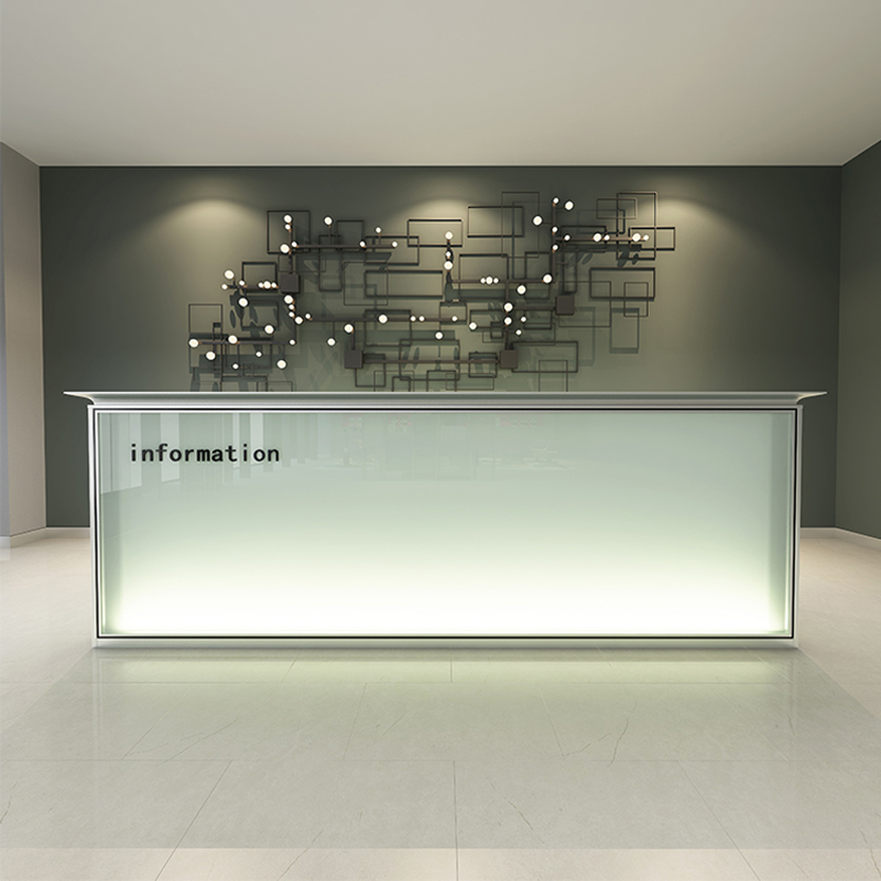 1.The white reception desk with lights has a 2420mm long and 540mm wide workstation. The table also has a 2420-long floating top, about 200mm wide, on which you can put booklets and pamphlets for visitors. The top of a writing desk can also be used as a casual office decoration, like a potted plant. Spacious workstations allow you to easily save work computers, printers, landlines and other important files.