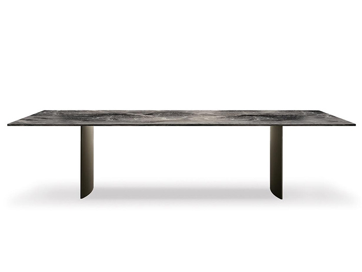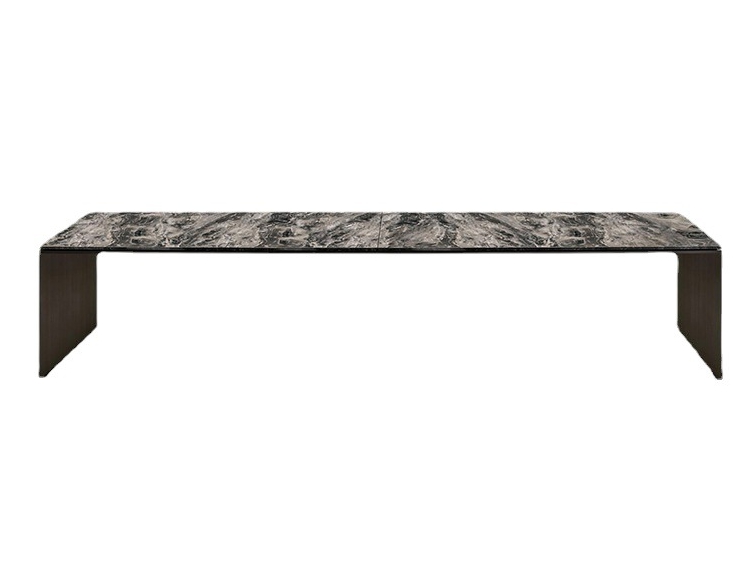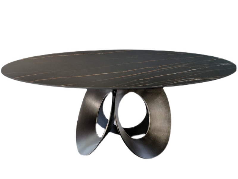 Beneath the surface, the base commands attention with three looped metal forms in a brushed black finish. These intersecting curves form a stable and visually dynamic foundation, blending functionality with modern art.