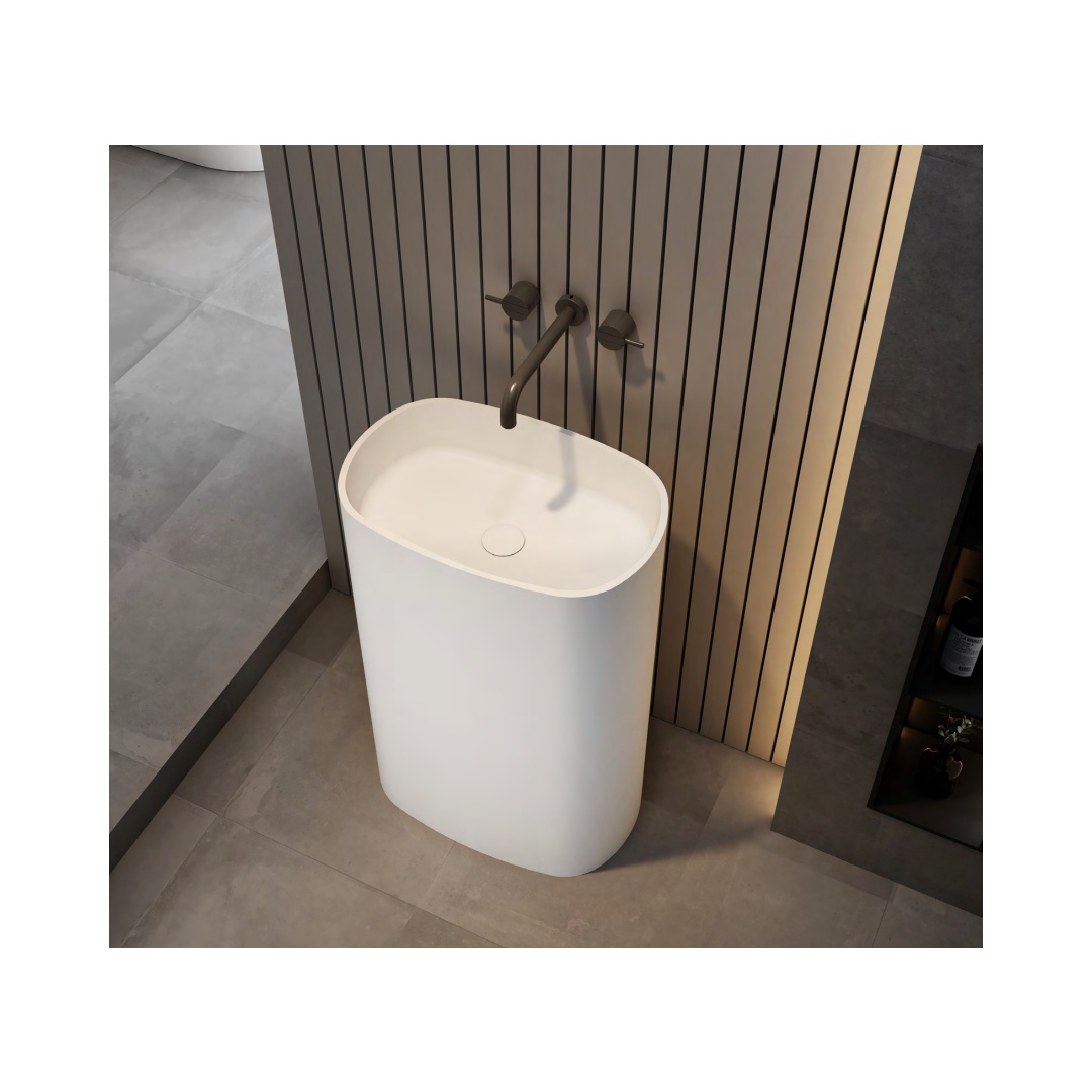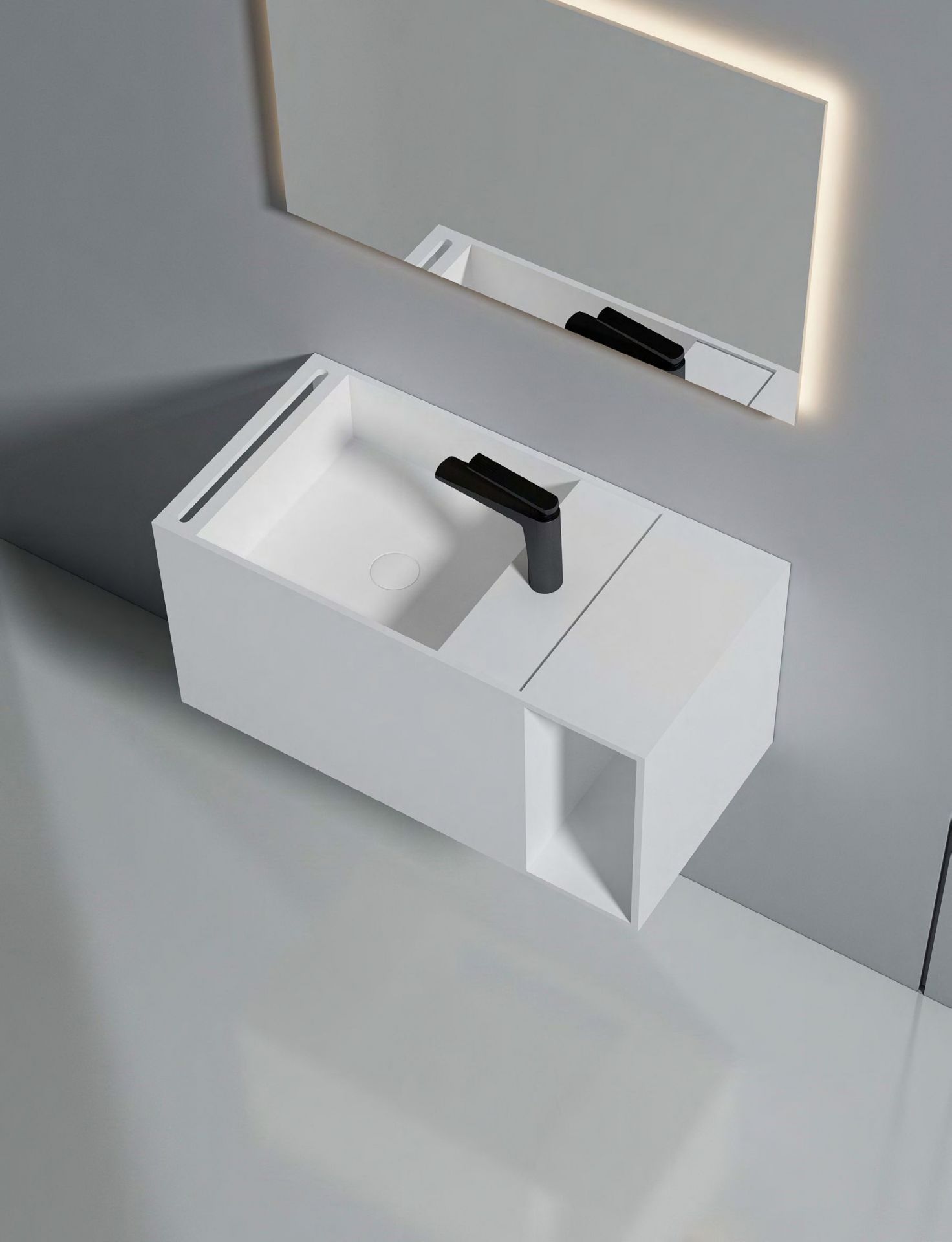 Its pure white finish enhances the brightness of any bathroom, while the integrated shape simplifies installation and cleaning. This model works exceptionally well in small yet high-end projects where design precision and utility are equally valued.