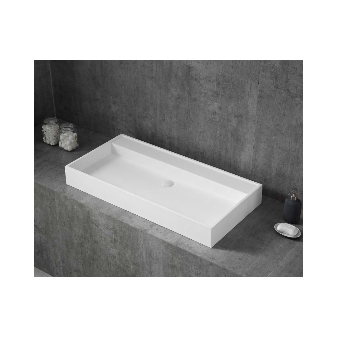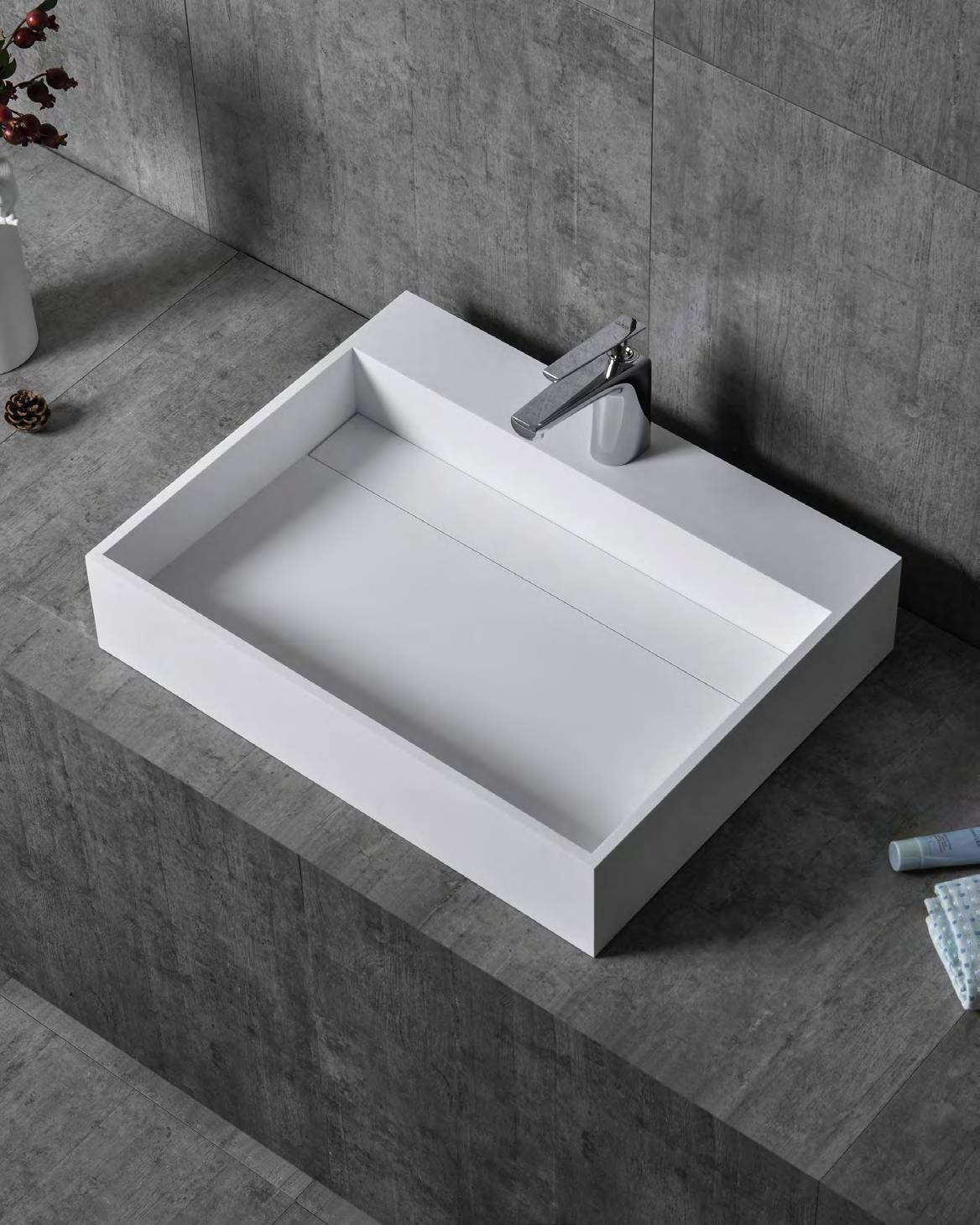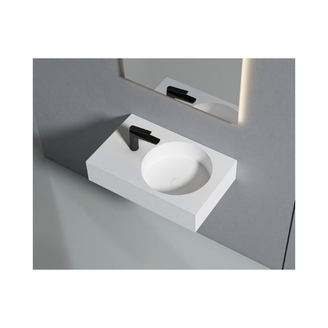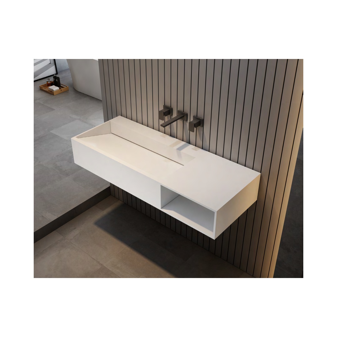 The STLBS5995 wall-mounted basin embodies functional minimalism, offering a slim rectangular design ideal for modern apartments and hotel bathrooms. Made from durable solid surface material, it features a precision-crafted basin area alongside a flat platform that can hold toiletries or small decor.