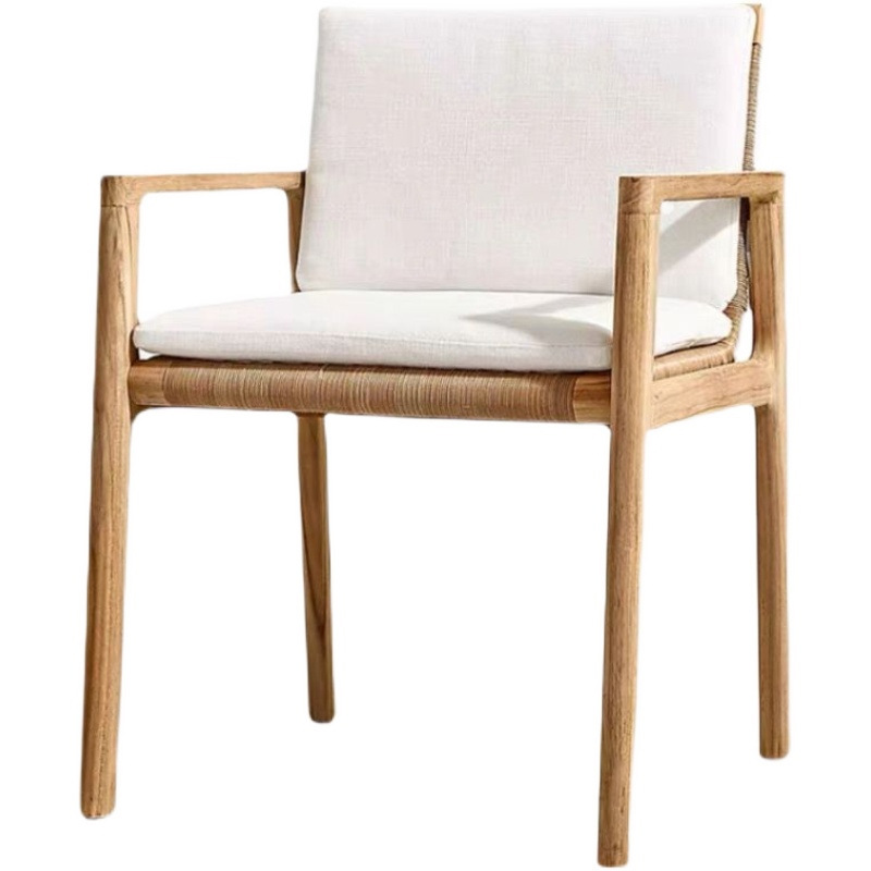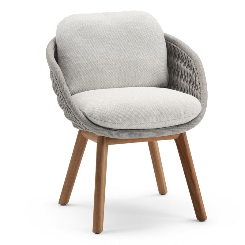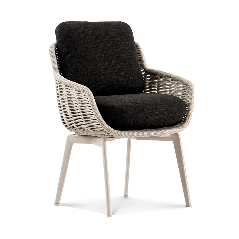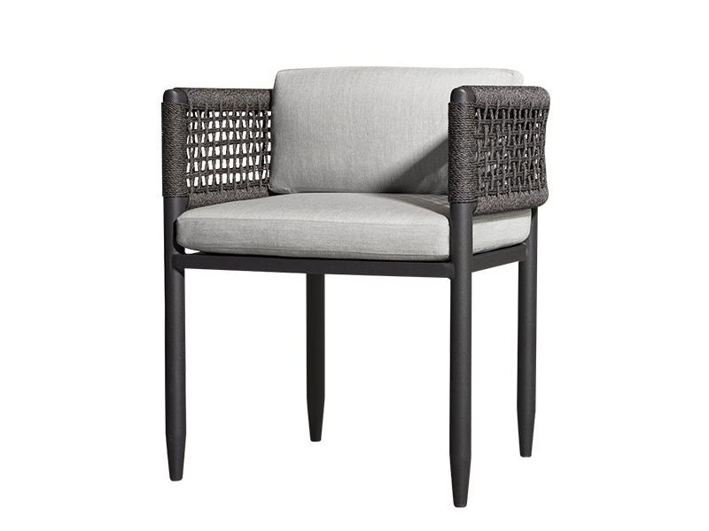 This chair features an expertly woven rope backrest, adding a contemporary texture while ensuring supportive comfort. The seat and plush button-tufted back cushion are crafted for ultimate relaxation, offering a welcoming and luxurious seating experience for hotel guests.