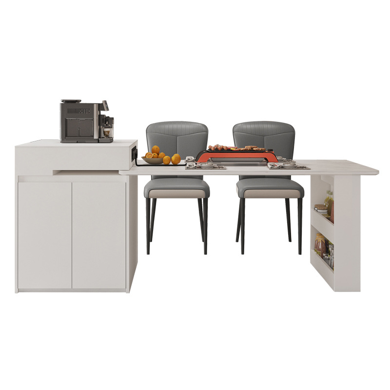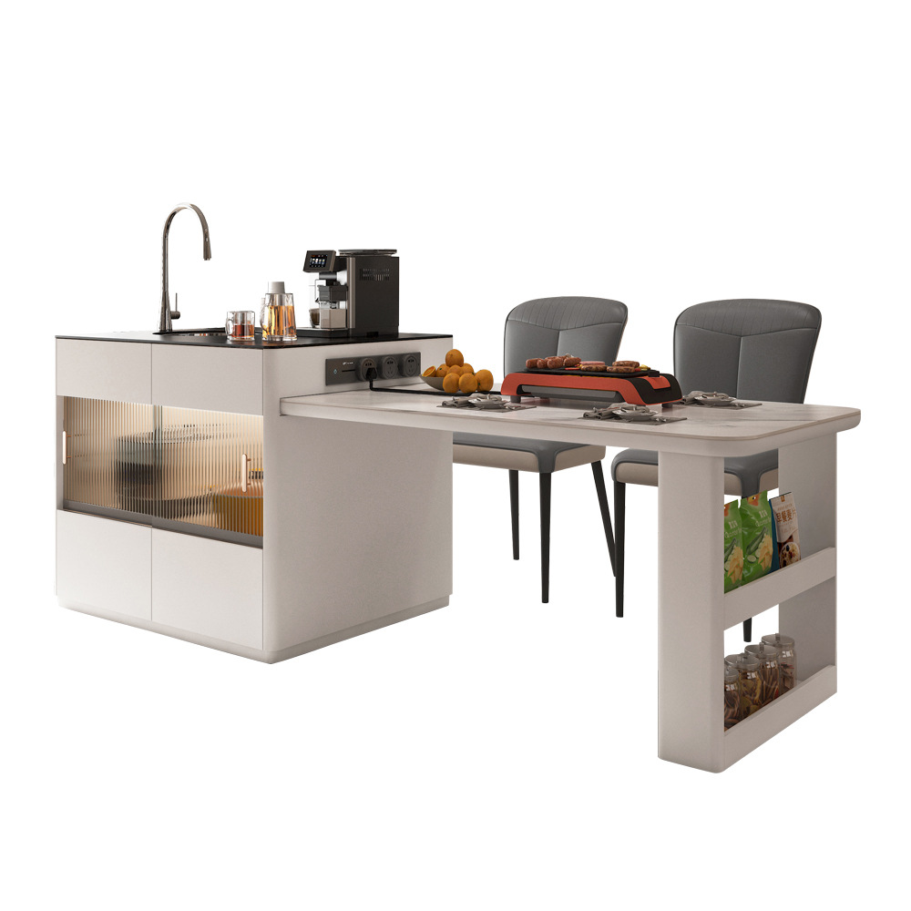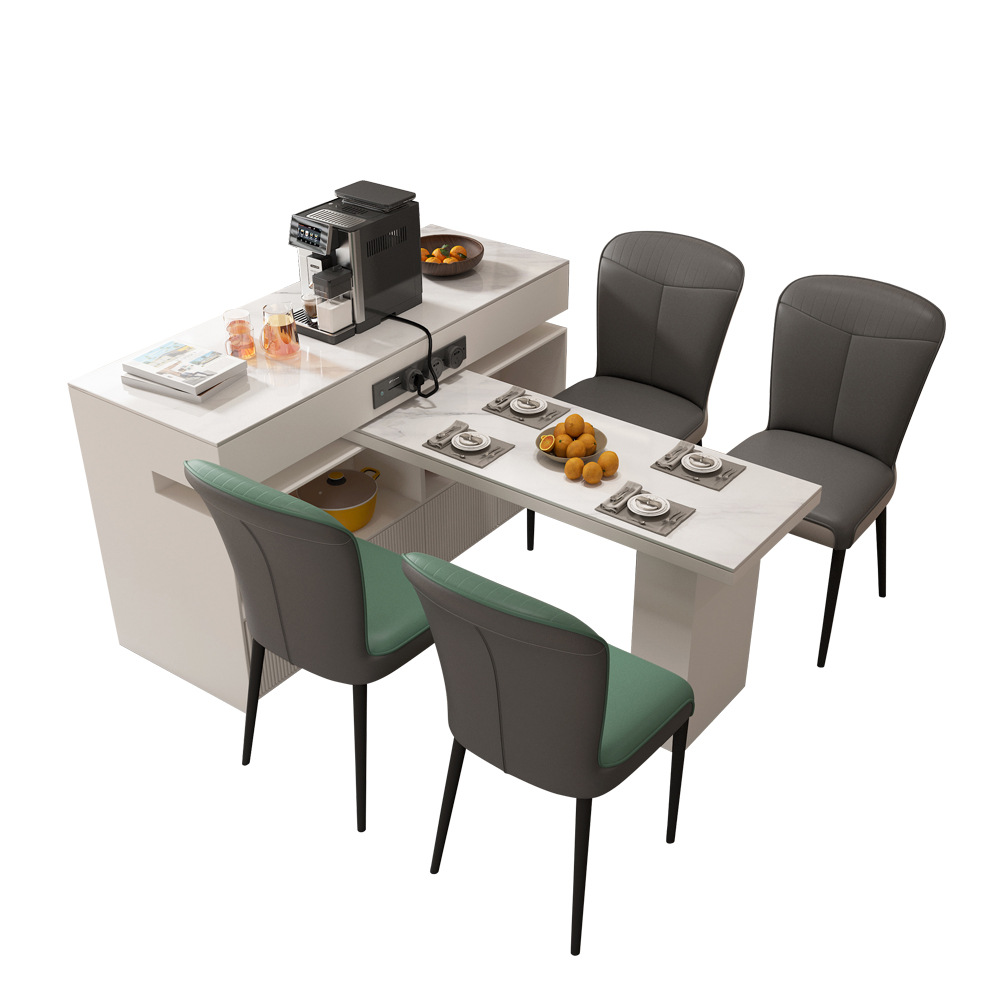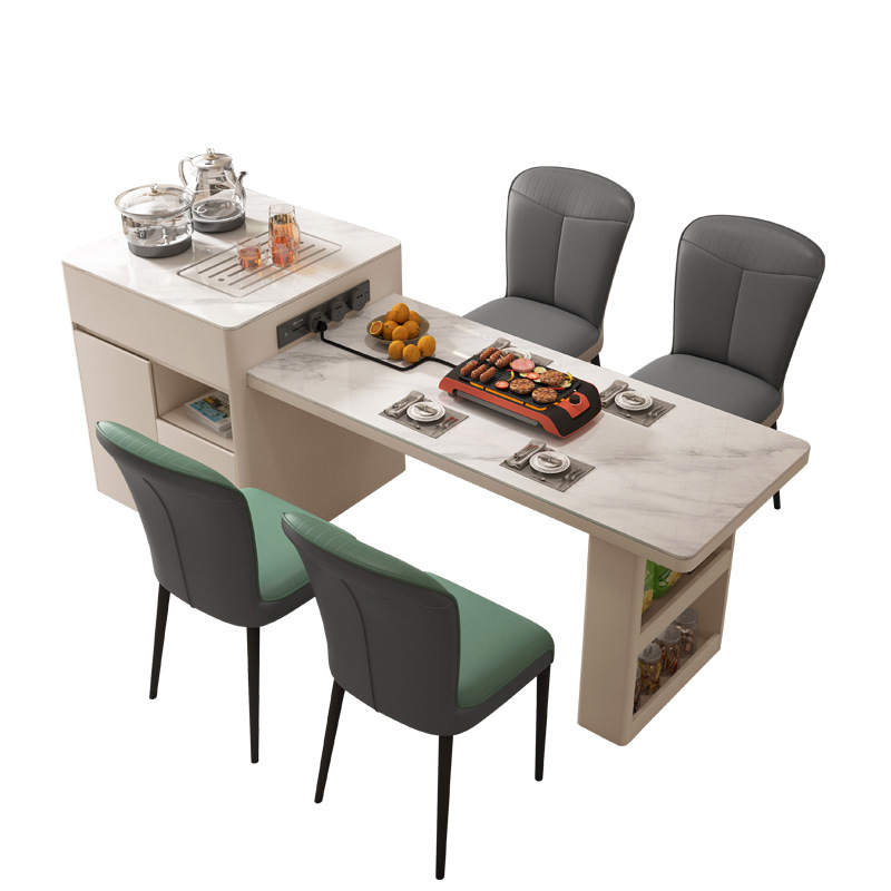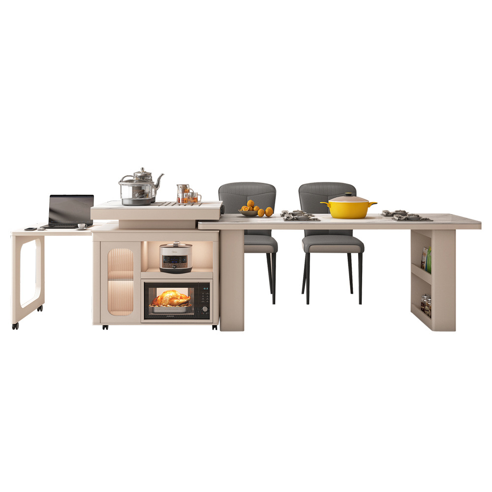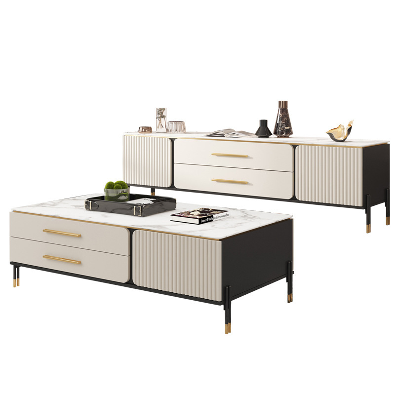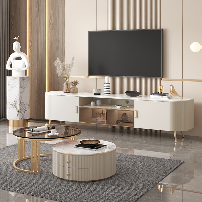 The nesting tables include a large marble-top table on a gold-metal sculptural base, plus a smaller cylindrical table with matching marble surface and storage drawer. Their rounded forms and metal accents echo the console’s design language, creating a cohesive styling statement.