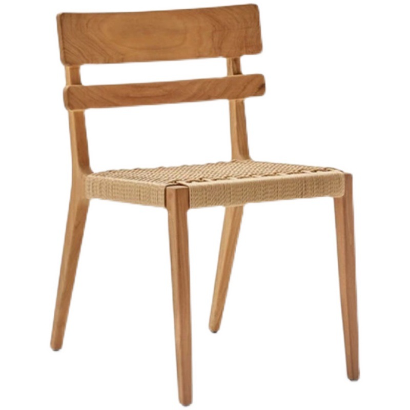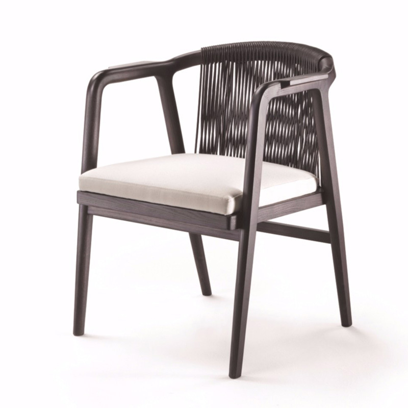 The woven backrest, crafted with precision, adds a textural depth that not only supports but also enhances the aesthetic appeal. The plush, white upholstered seat cushion offers exceptional comfort, making it ideal for long, leisurely meals or refined business lunches in hotel restaurants.