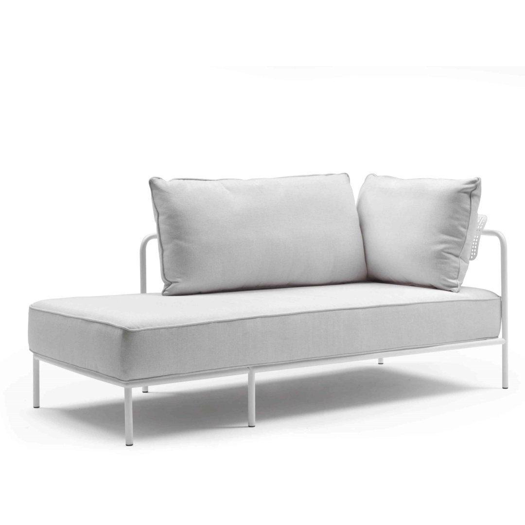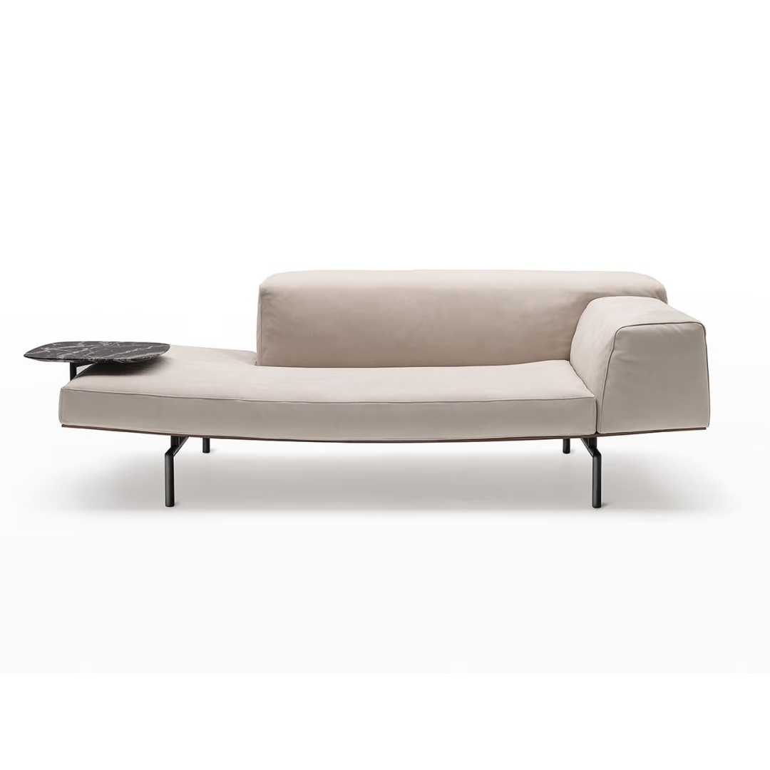 The chaise rests on a powder-coated steel base with slender legs, creating a floating effect ideal for minimalist interiors. The leather surface is treated for stain resistance and durability, ensuring straightforward maintenance in high-traffic hospitality settings. Hidden glides on the base protect flooring and allow slight chaise repositioning.
