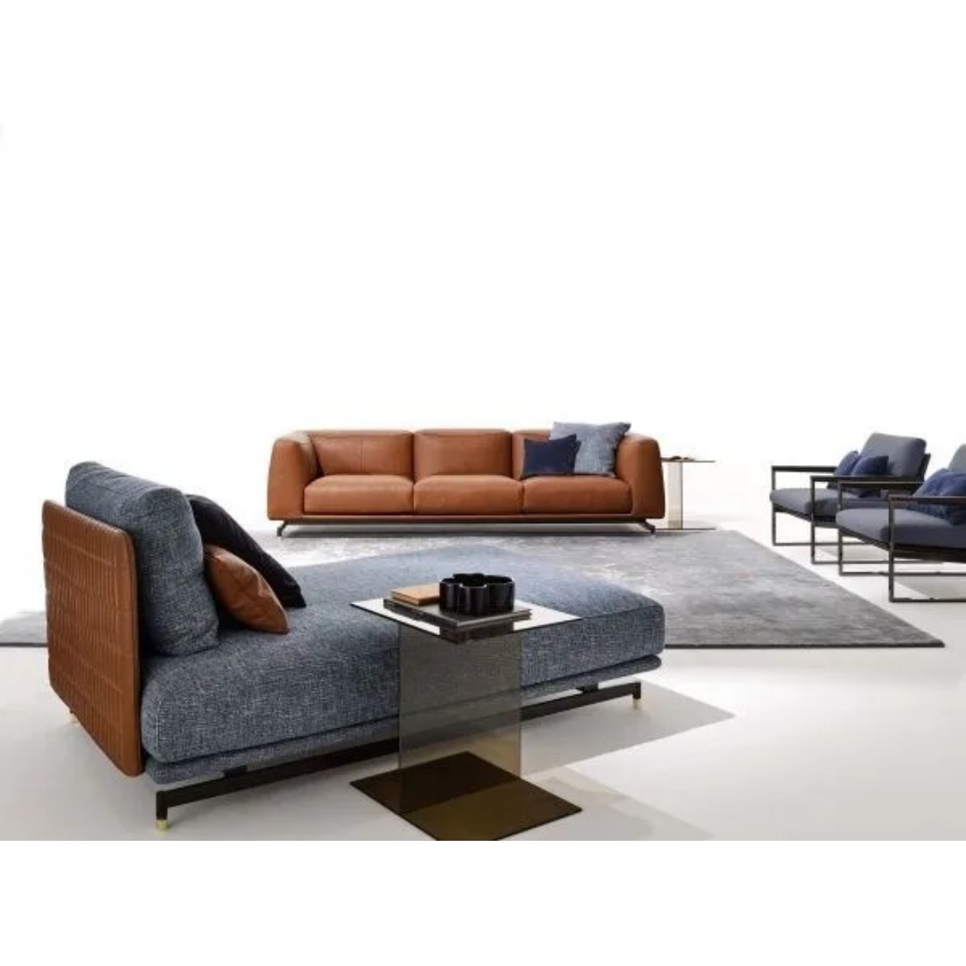 The STLSB7104 sofa bed brings contrast and sophistication with its mixed-material design. A richly woven blue fabric forms the seat, while the backrest is detailed in warm tan leather with vertical stitching. Anchored by a clean black metal frame with brass foot accents, this piece is made for modern hotel lounges, reception spaces, or high-end suites.