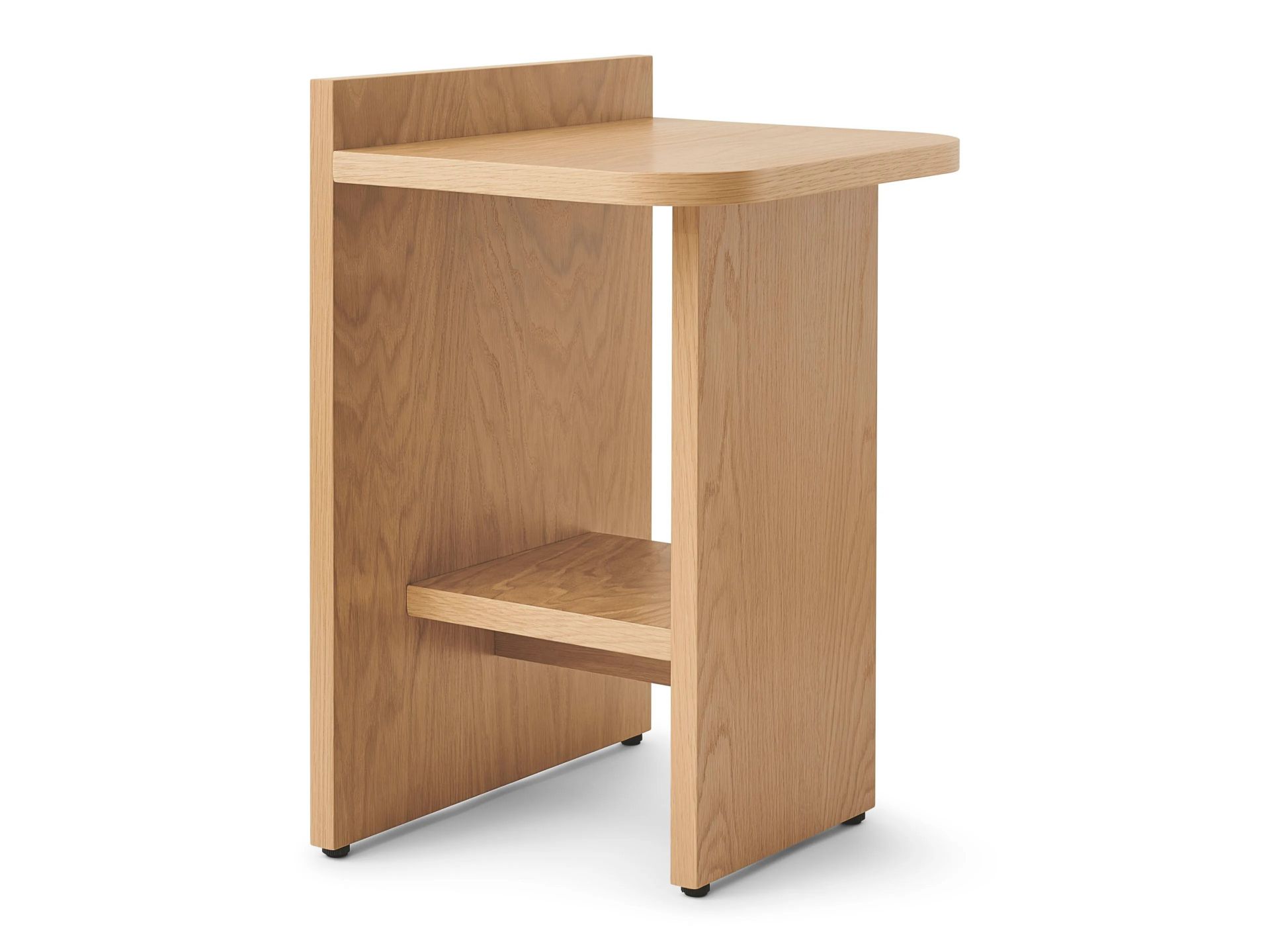 The raised back panel helps keep items secure, while the integrated shelf offers space for books, devices, or decorative objects. Its compact footprint makes it especially suitable for smaller rooms without sacrificing usability.