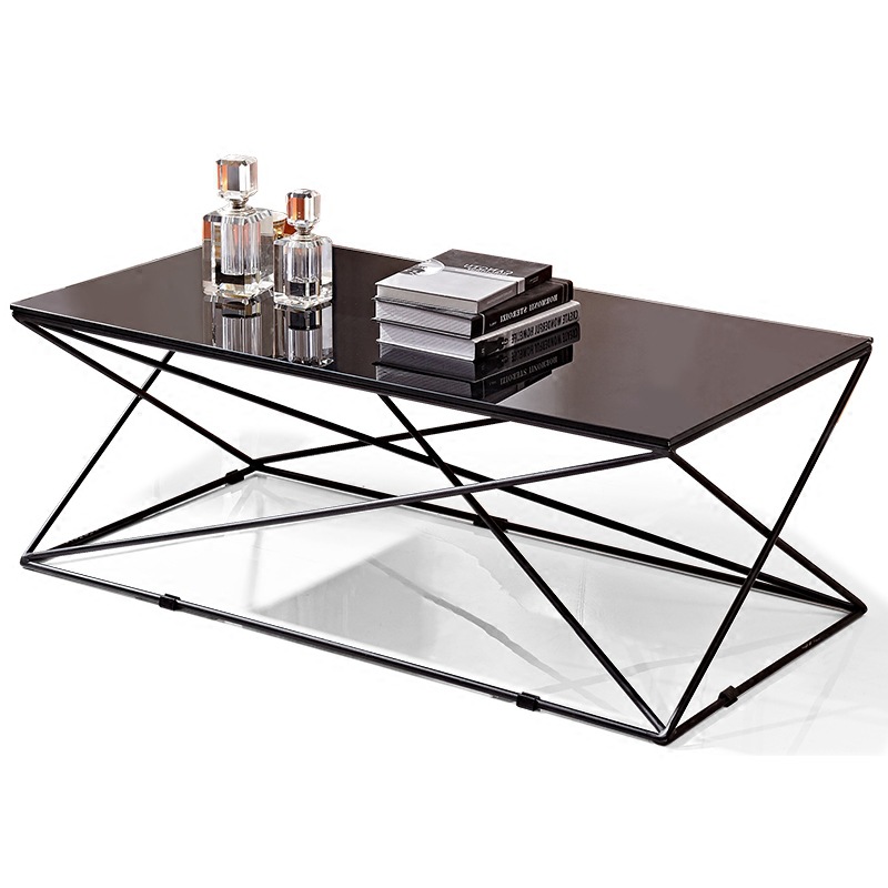 The STLTT804 coffee table presents a 120 × 50 cm black tempered-glass surface mounted on an intricate powder-coated steel wireframe base. The crisscrossed rods form a dynamic, low-profile structure that adds visual interest without overwhelming surrounding seating.